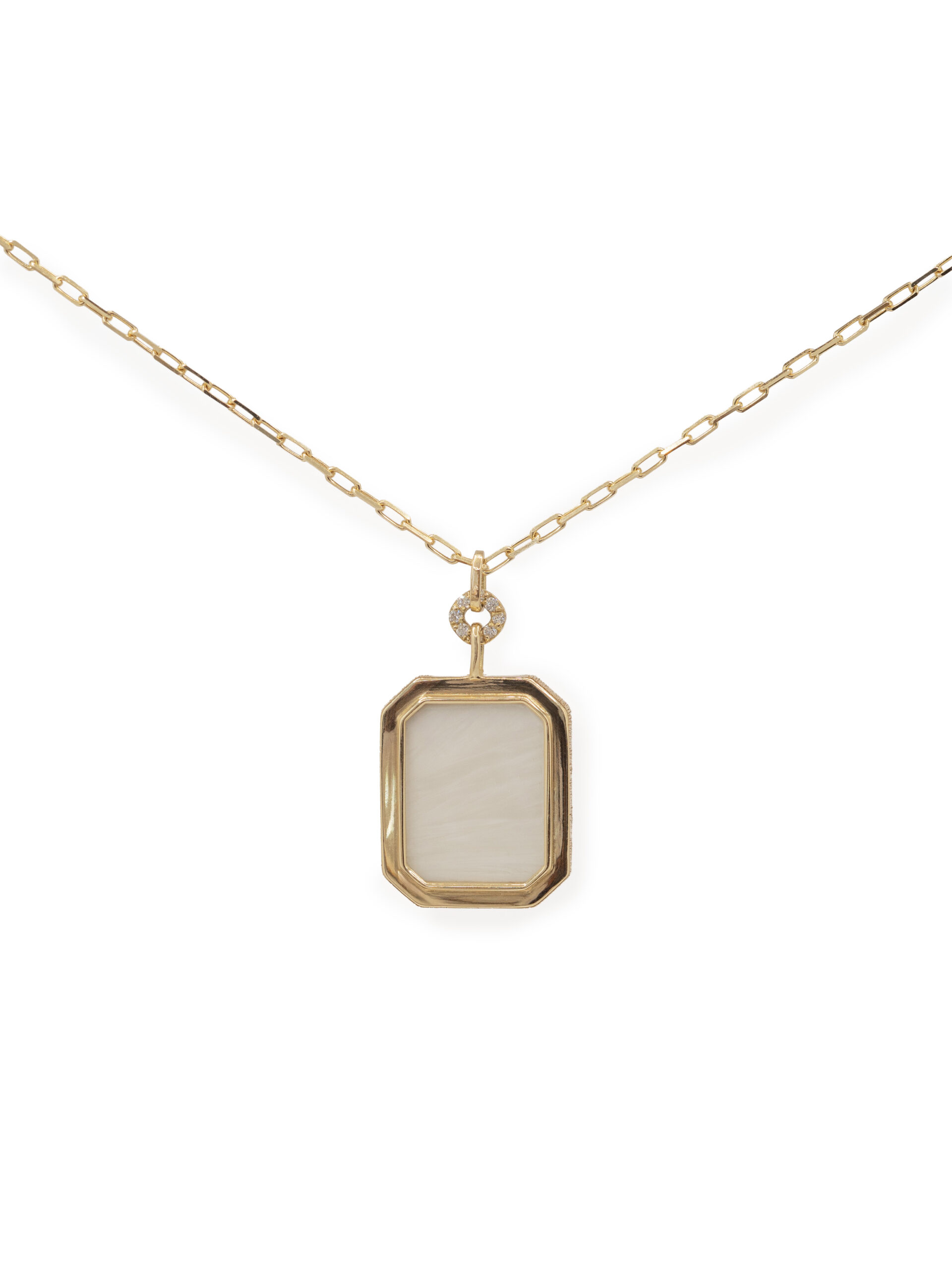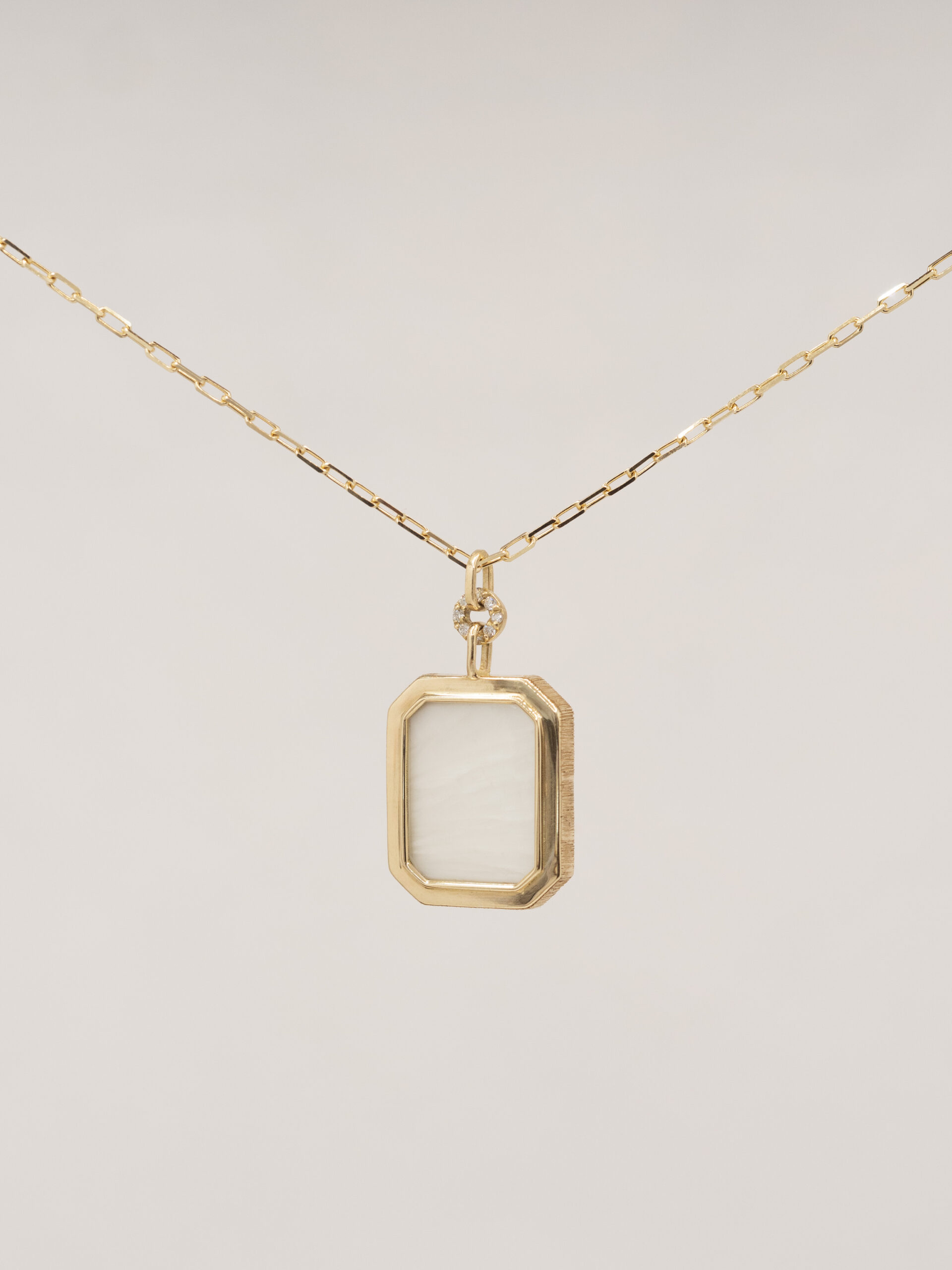 Sculpté comme un éclat de lumière, le collier Lumen présente un pendentif taille émeraude, orné d’une gemme de porcelaine aux cristaux uniques, sertie dans une monture d’or finement ciselée sur les côtés.