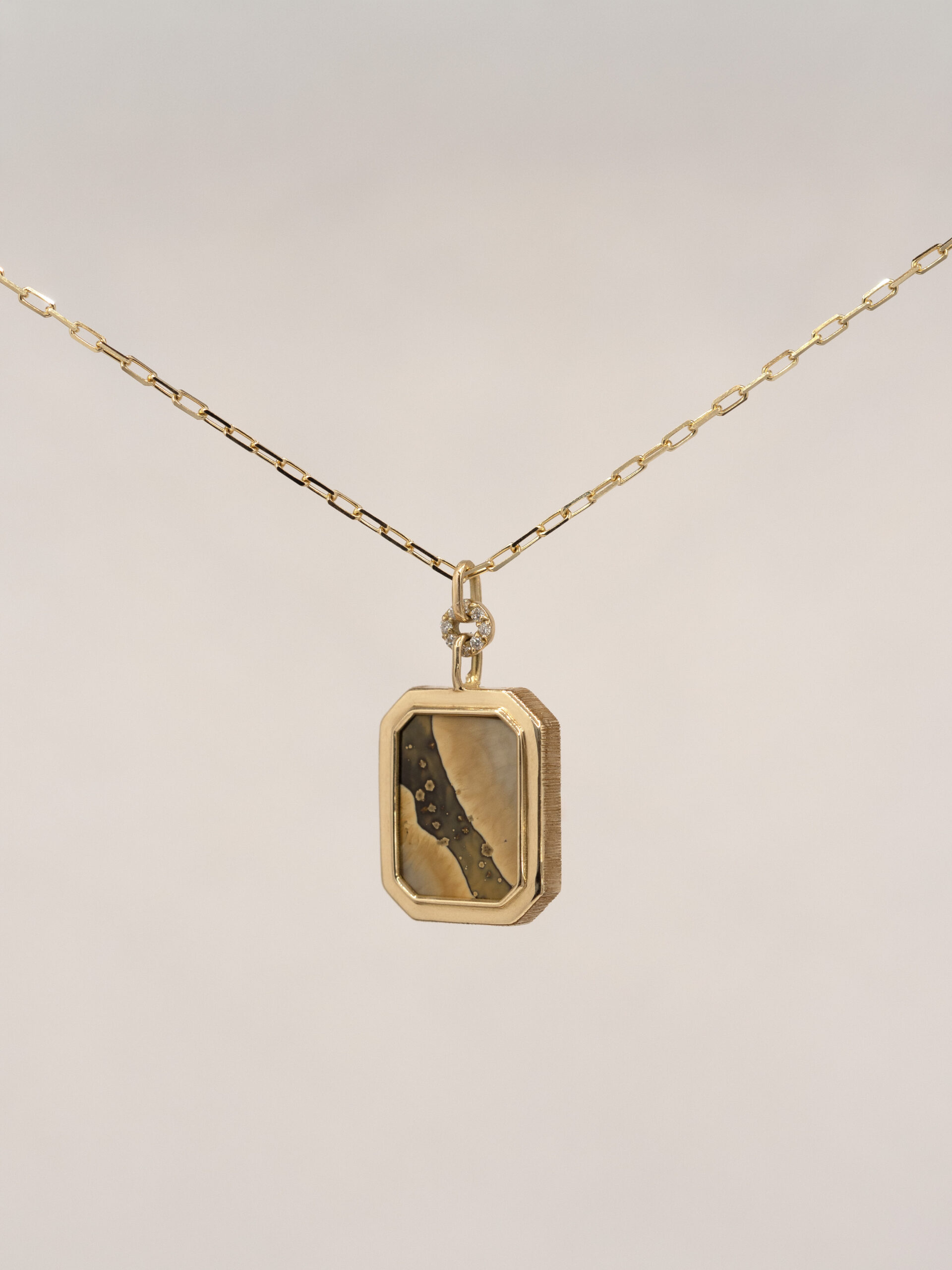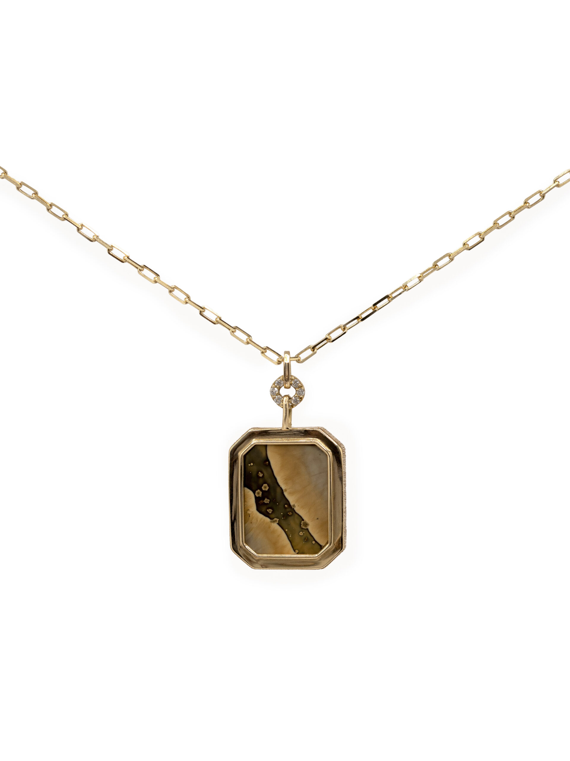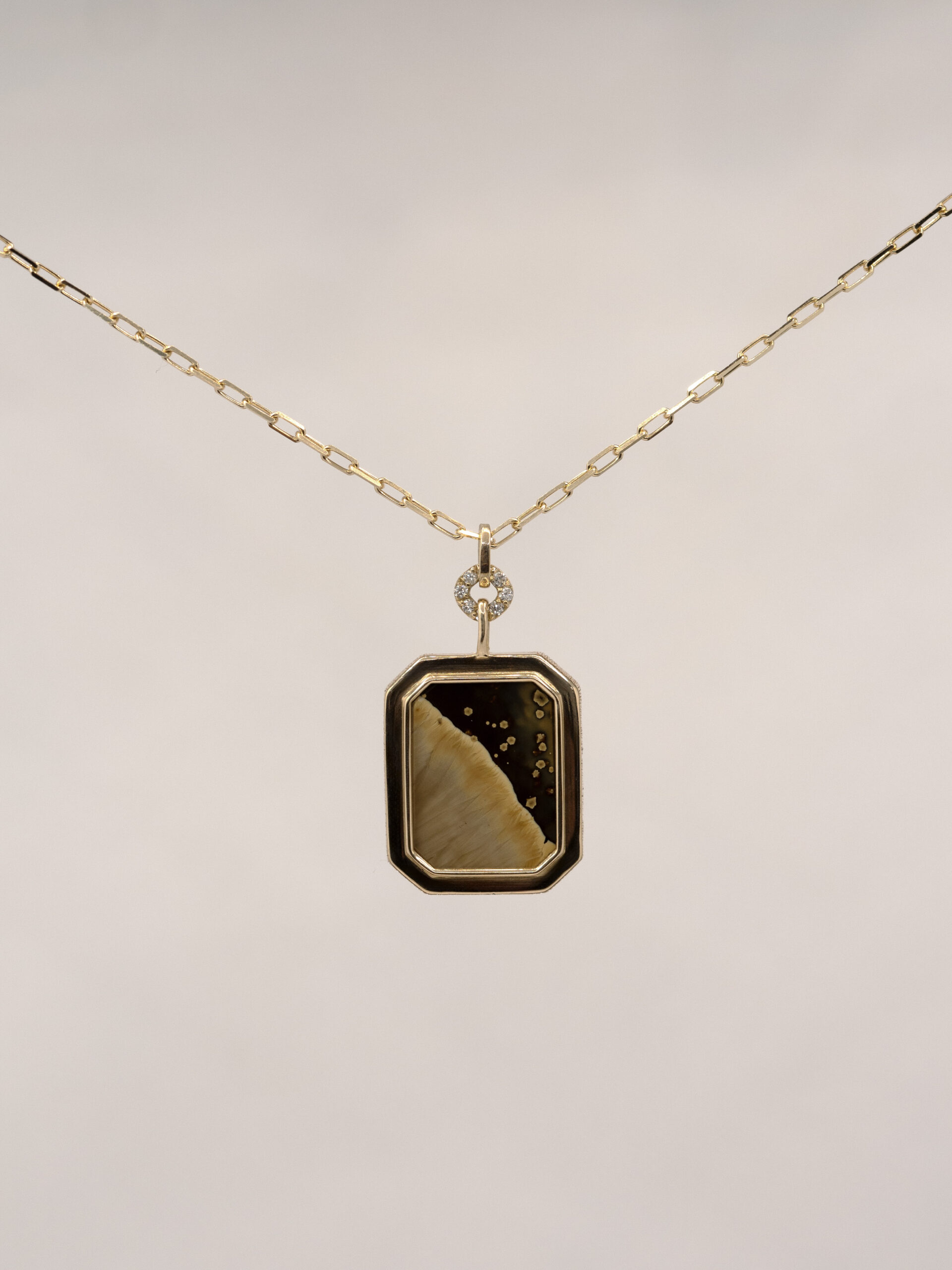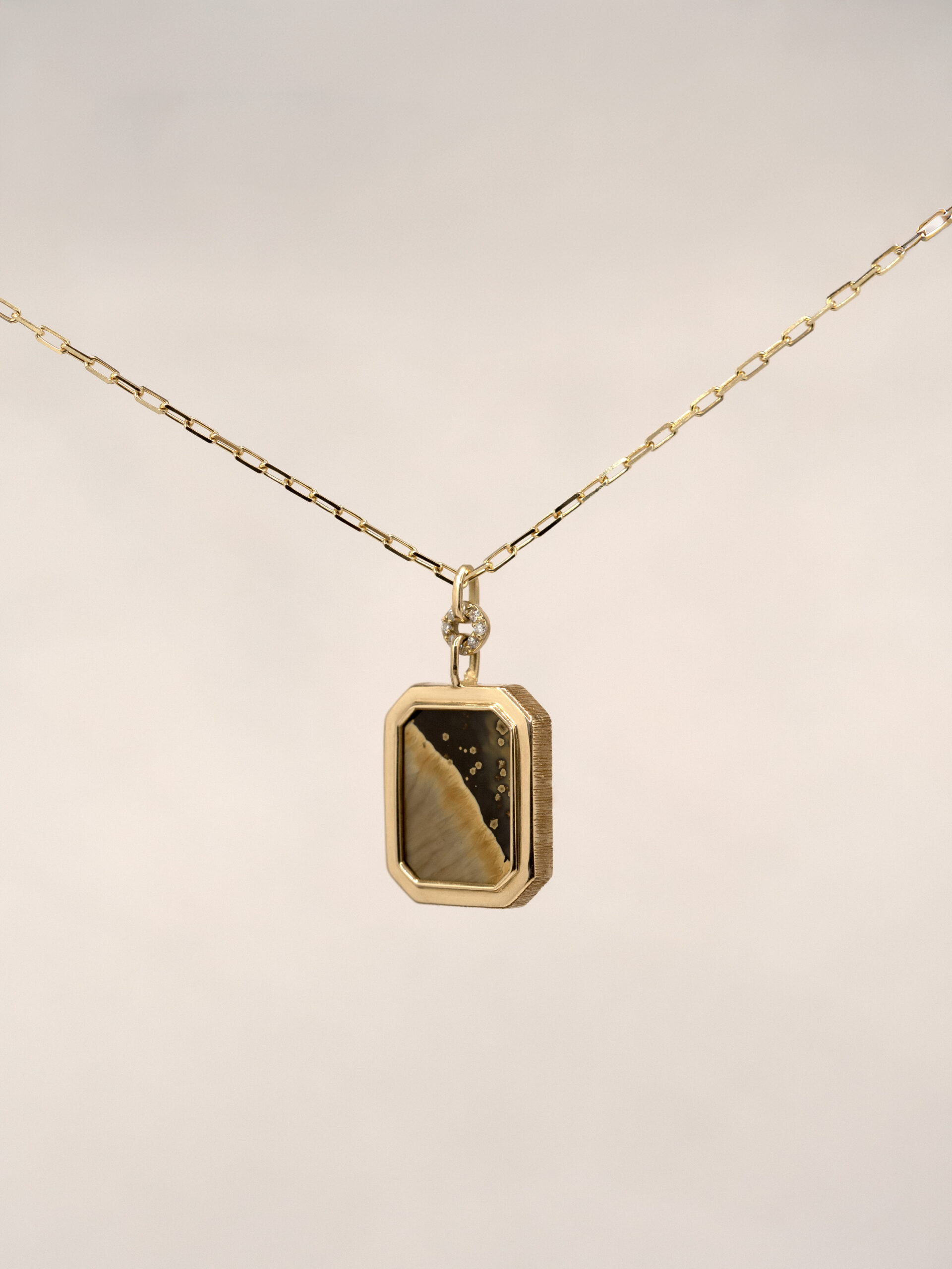 Sculpté comme un éclat de lumière, le collier Lumen présente un pendentif taille émeraude, orné d’une gemme de porcelaine aux cristaux uniques, sertie dans une monture d’or finement ciselée sur les côtés.