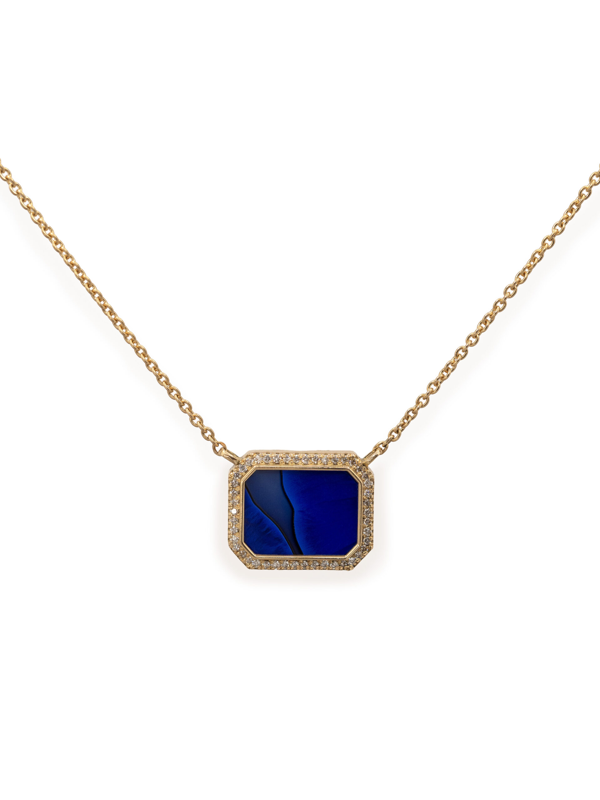 Né du feu et du geste, Silica célèbre la beauté de l’émail cristallisé. Son pendentif en or jaune 18k, entièrement pavé de diamants, encadre une gemme de porcelaine où la cristallisation a figé la matière.